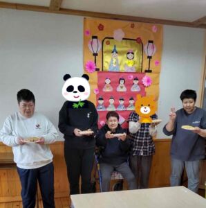 2026-03-12 2026年 ひな祭り さくら園本館 楽しい行事 今日は楽しいひな祭り 3月3日は桃の節句ひな祭りです 今年も中々凝った雛飾りが出来ました ちなみに手に持っているのは雛あられでも菱餅でもなく 自分達で作った手作りスイーツです 今年も無病息災で過ごせますように